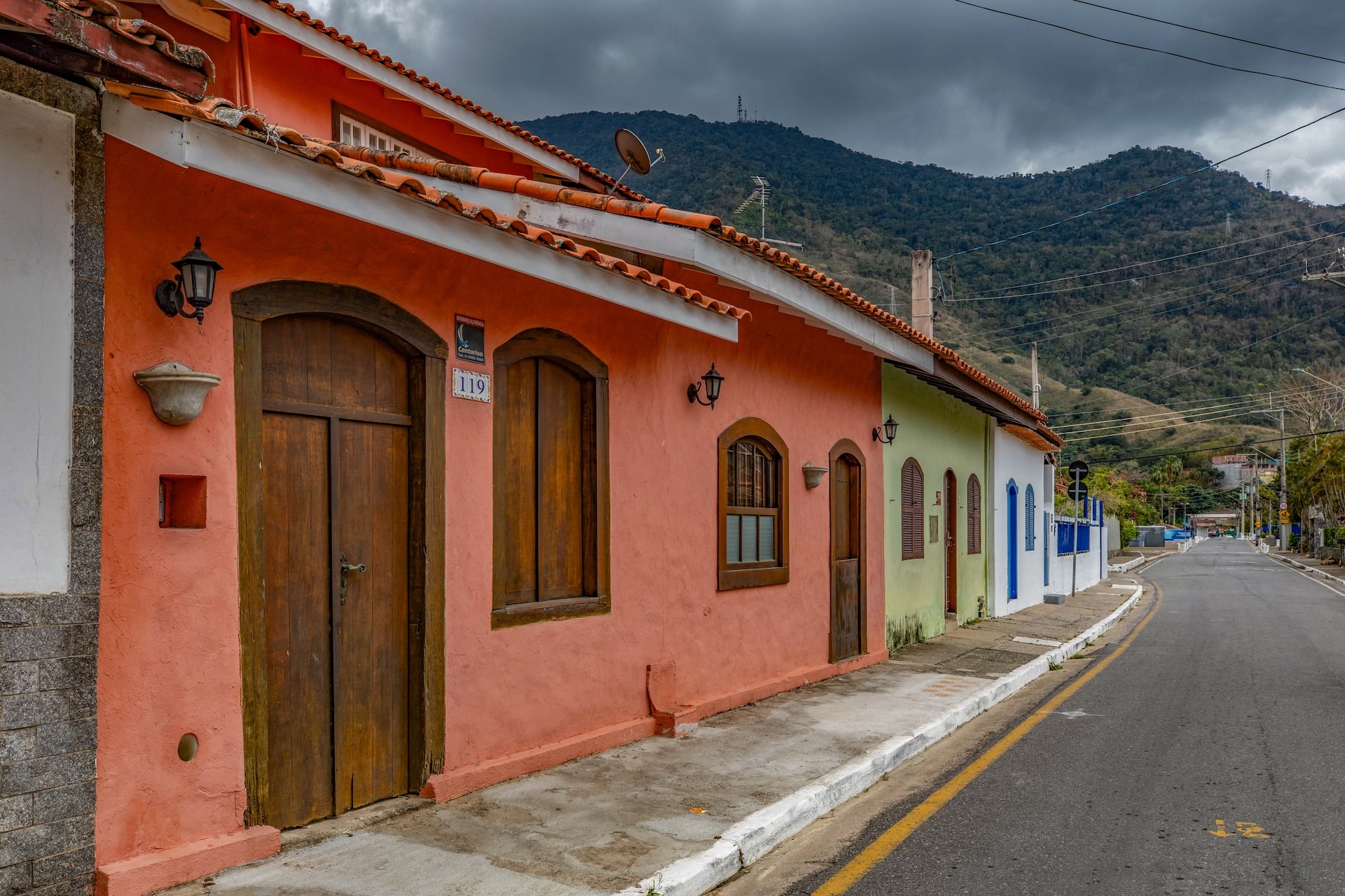 Casas coloridas de estilo colonial com vista para as montanhas ao fundo.