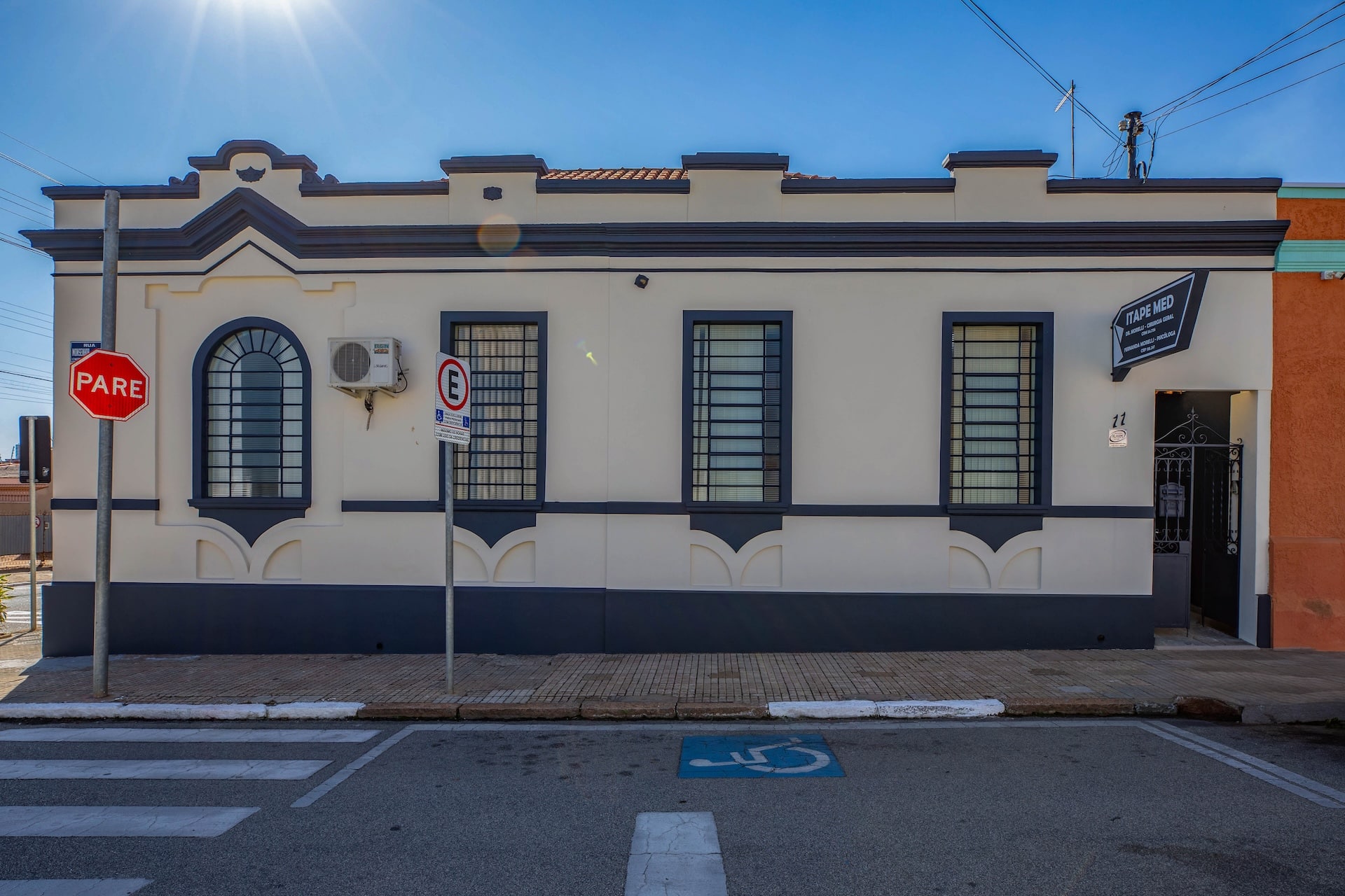 Casarão em estilo eclético com influência clássica, típico do início do século 20. A pintura branca, com detalhes em azul-marinho, valoriza as formas geométricas, molduras e janelas com grades retas.