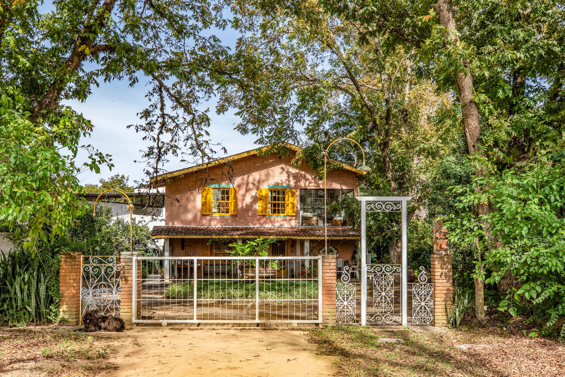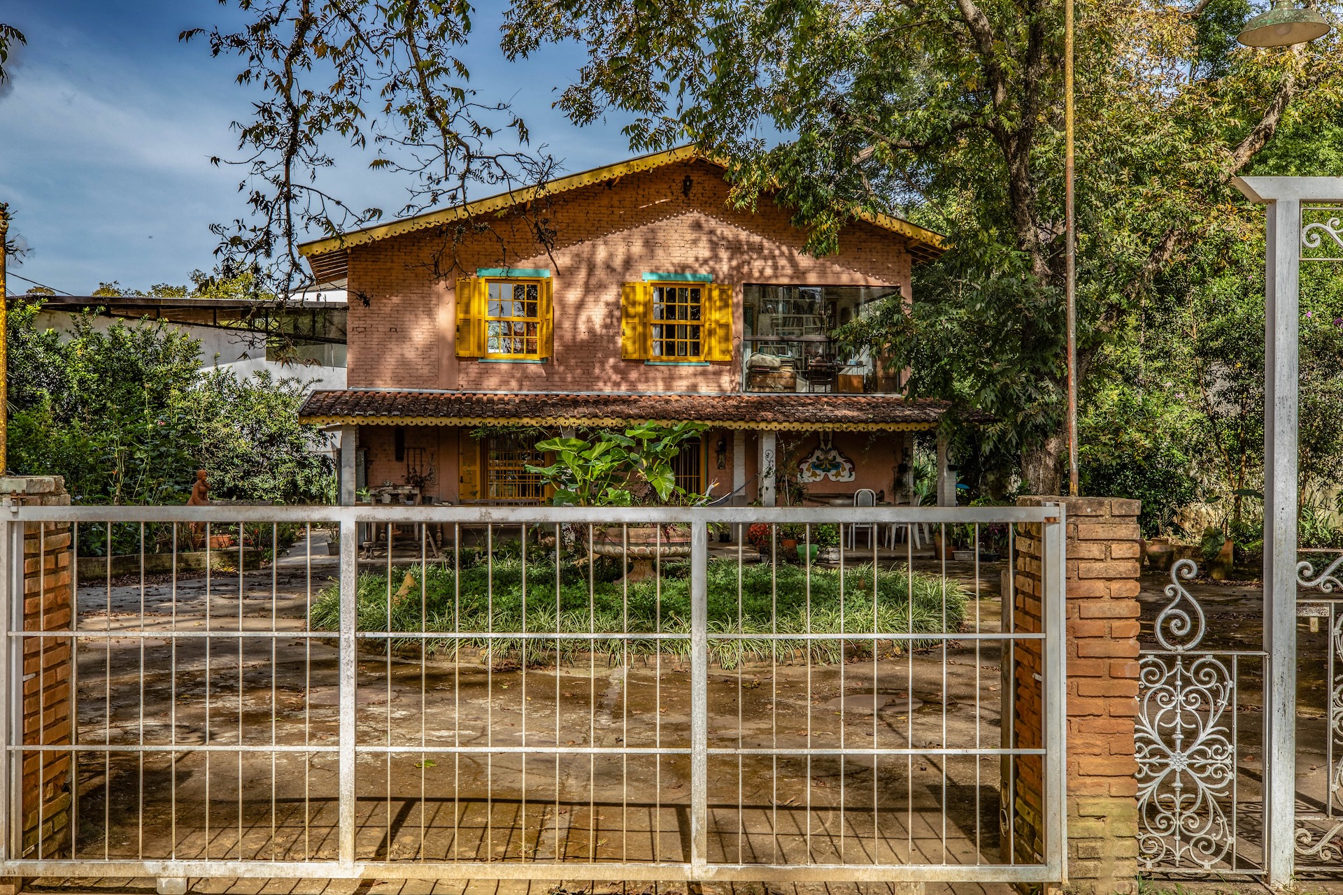 A fachada, com tijolos aparentes, é complementada por portões de ferro trabalhado com desenhos orgânicos que remetem ao estilo art nouveau, suavizando a rigidez do material e dialogando com a vegetação ao redor. A cobertura em telhas cerâmicas e o beiral largo se adaptam ao clima da Serra da Mantiqueira.