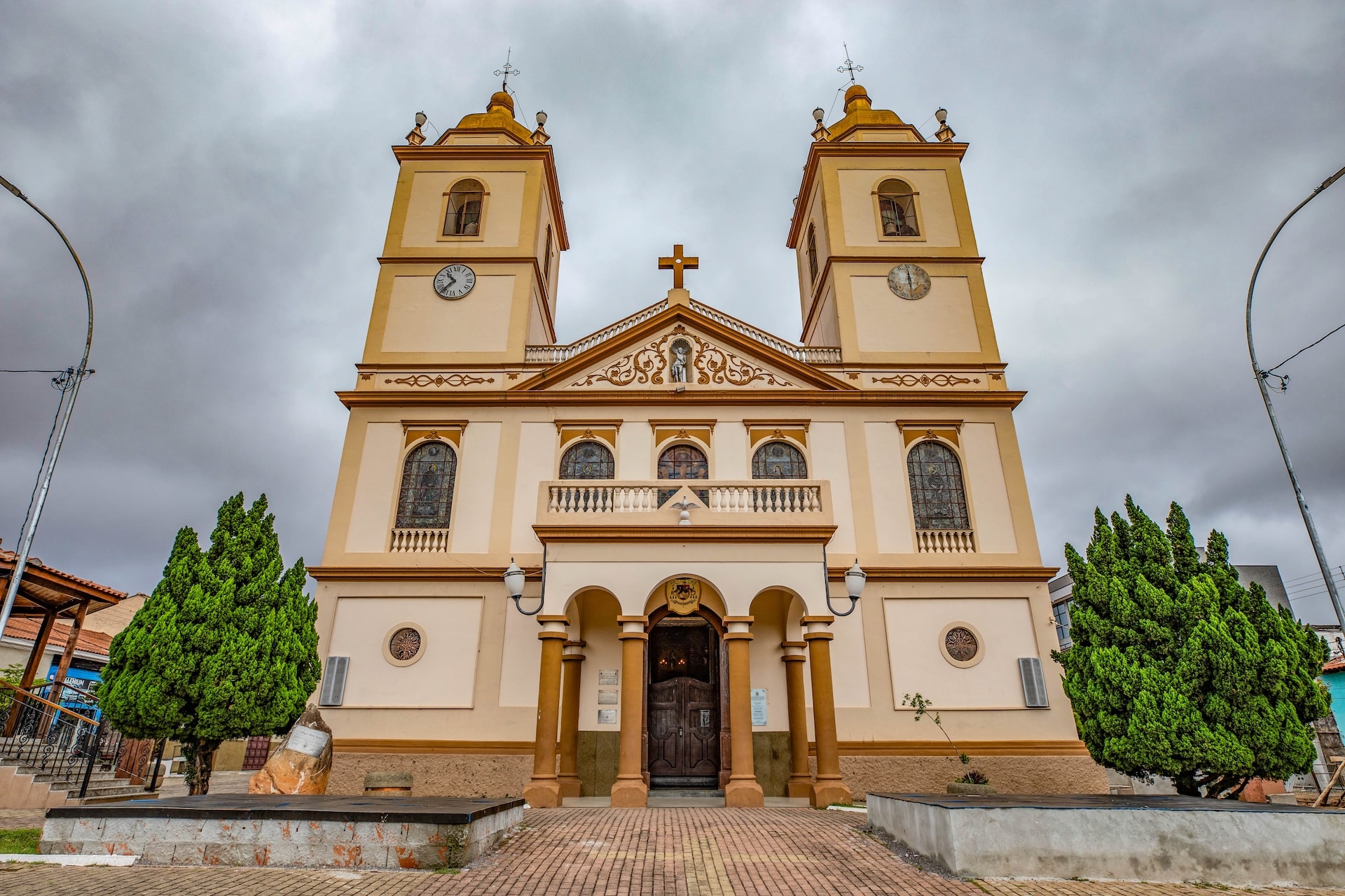 Construção do século 19 que apresenta estilo arquitetônico barroco mineiro, com fachada em tons de bege e marrom, marcada por imponentes pilastras que antecedem a porta central.