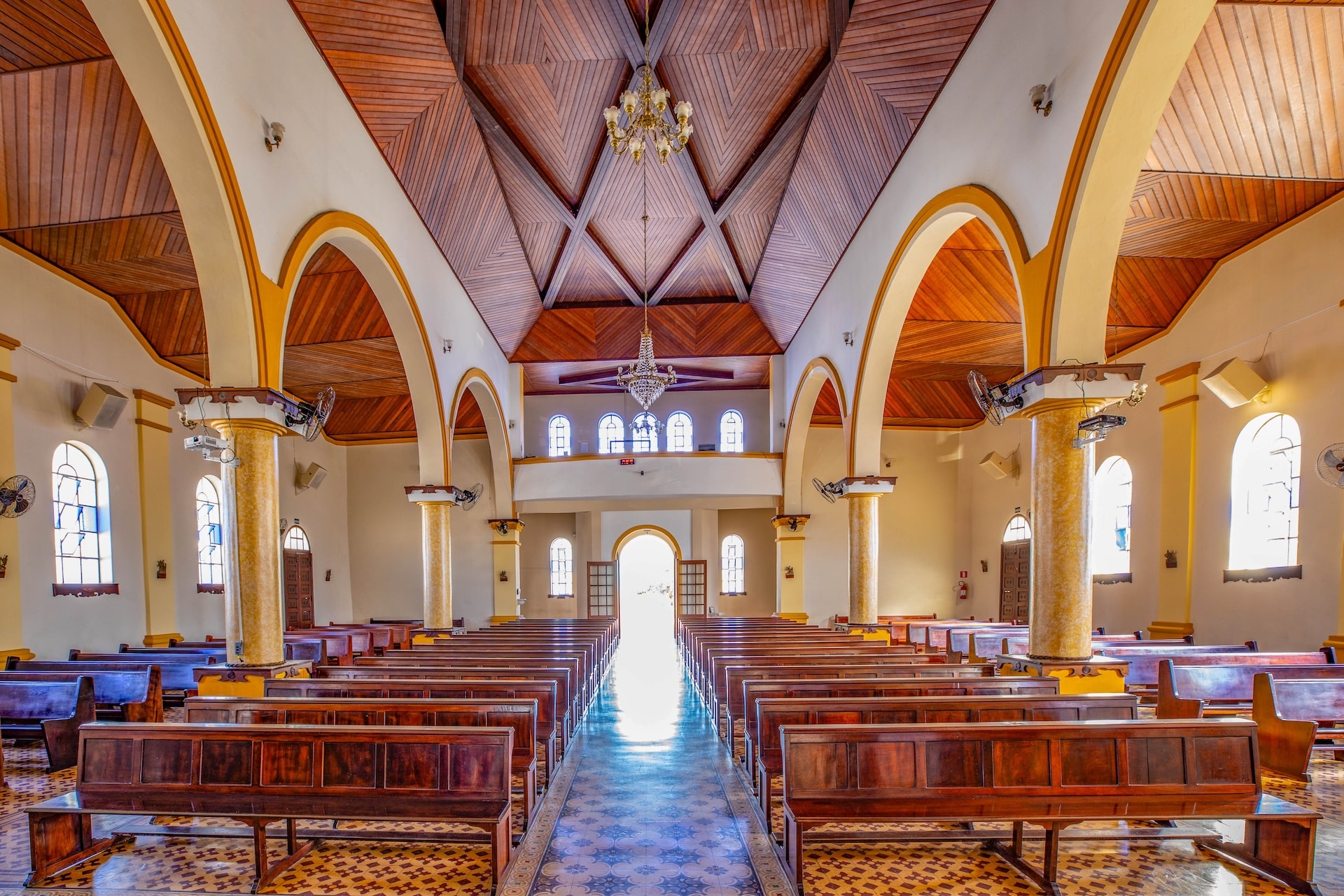 Fachada marcada por elementos clássicos e simétricos, com torres laterais, janelas em arco e frontão triangular central com uma cruz. Pintada em cores suaves, tem em frente a sua entrada a escultura de Nossa Senhora da Guia, posicionada na praça principal.