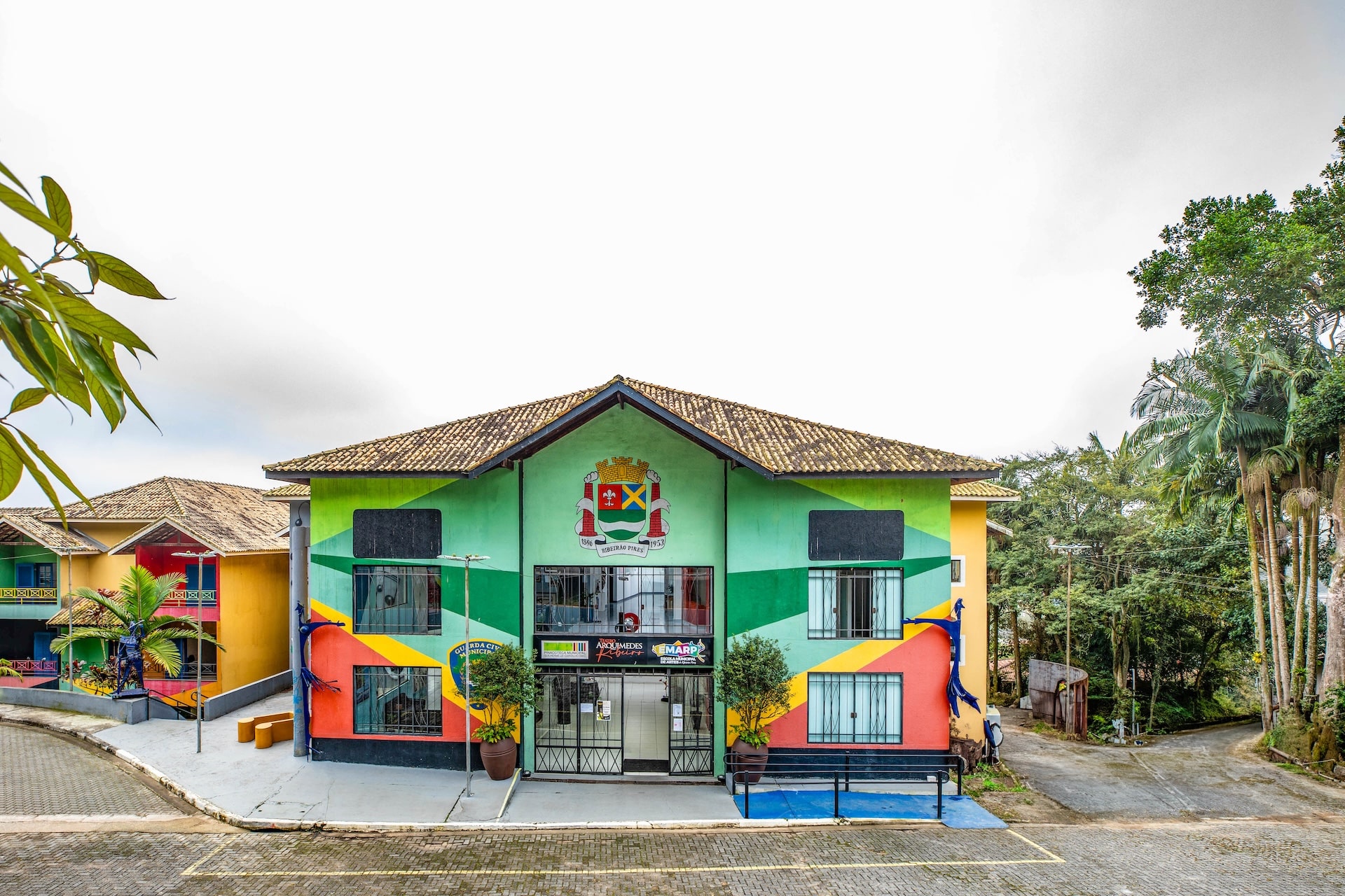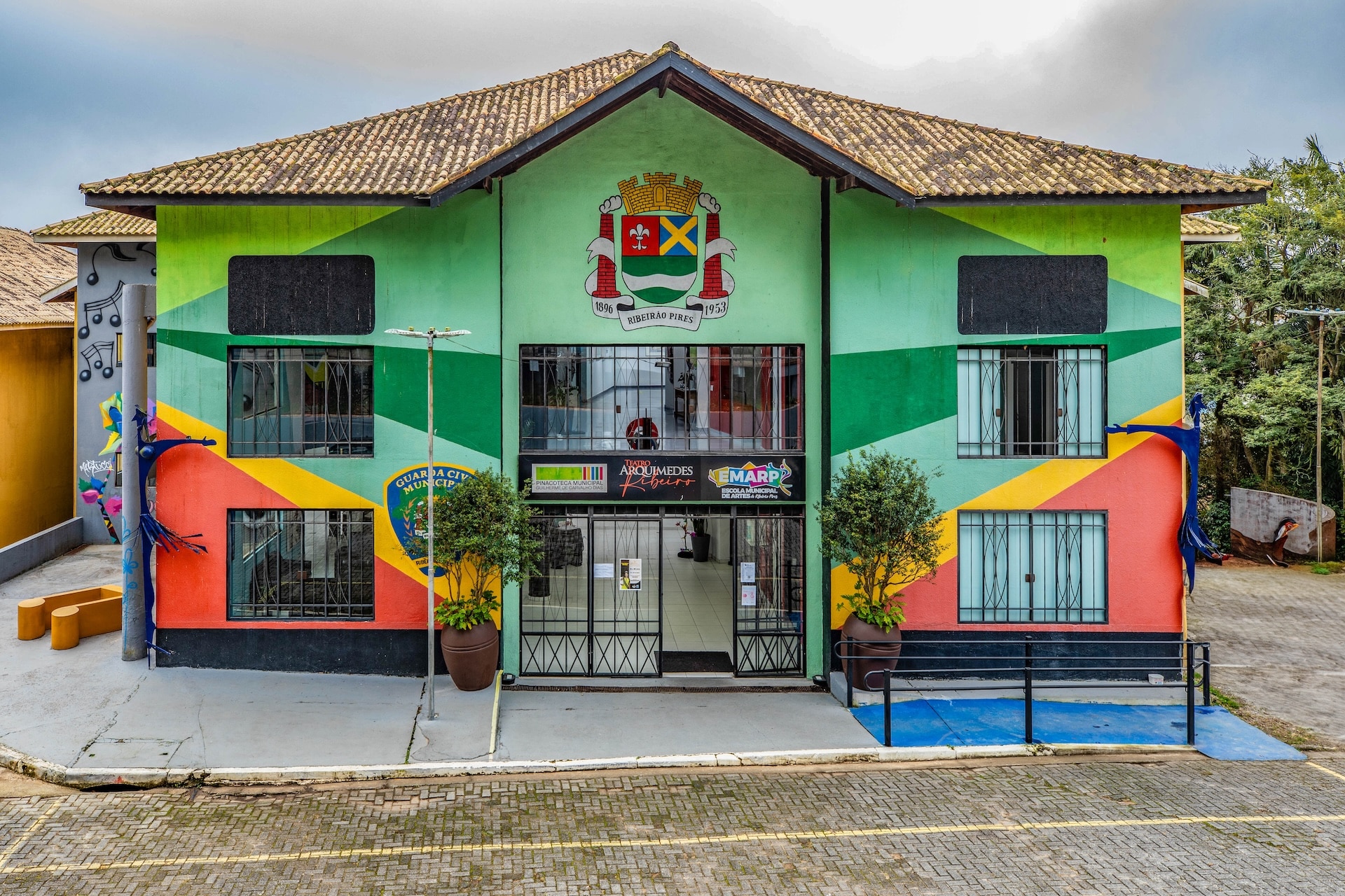 Edifício de dois andares, com telhado de duas águas em cerâmica. A entrada central, ampla e envidraçada, é protegida por portões de ferro. A fachada é pintada com formas geométricas em cores vivas, como verde, amarelo, vermelho, preto e azul, dispostas em composição diagonal, remetendo aos elementos da bandeira da cidade.