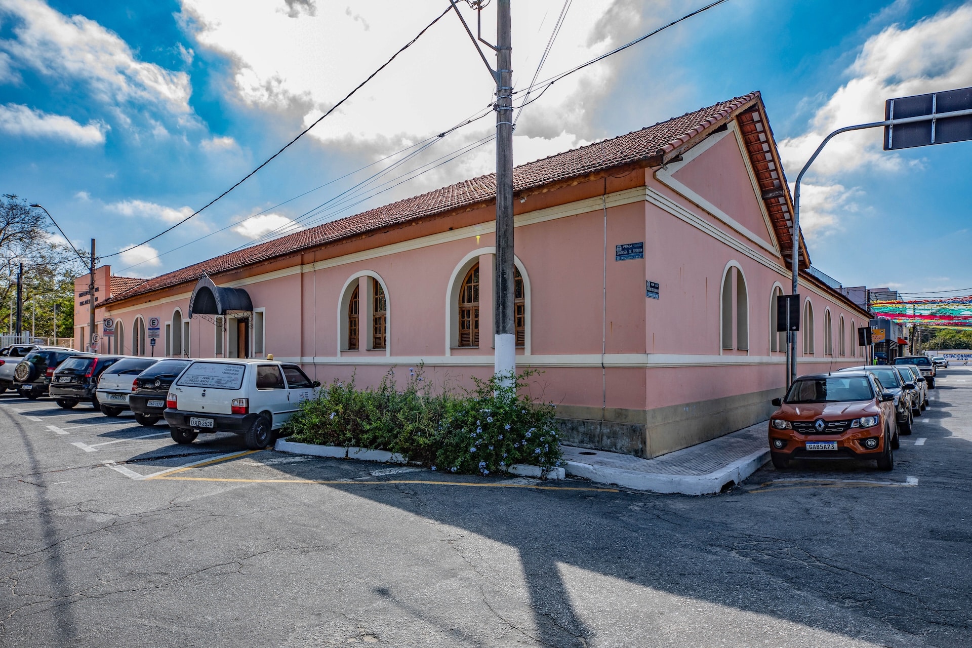 A construção apresenta traços da arquitetura ferroviária, com volumetria alongada e telhado cerâmico em duas águas. As paredes, pintadas em tom rosado com detalhes em branco, contrastam com as esquadrias de madeira das janelas em arco.