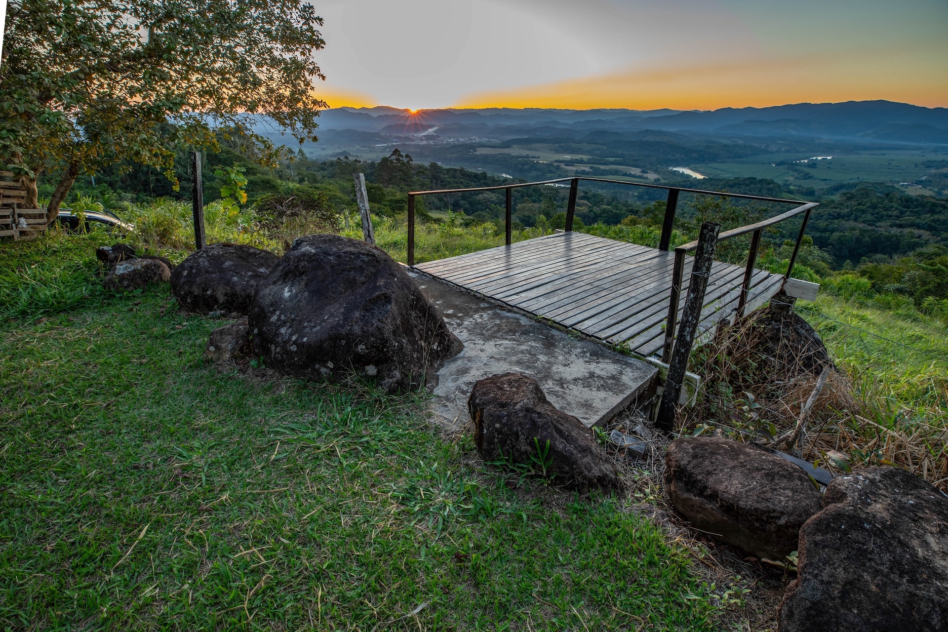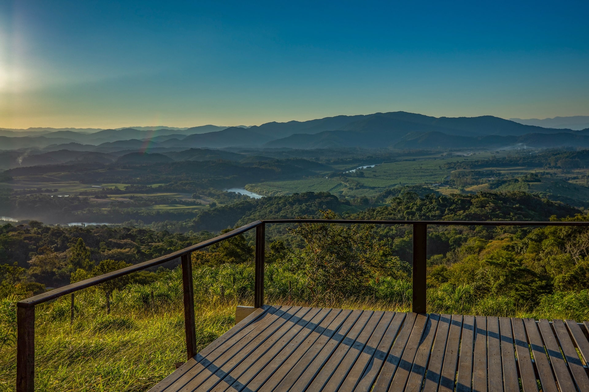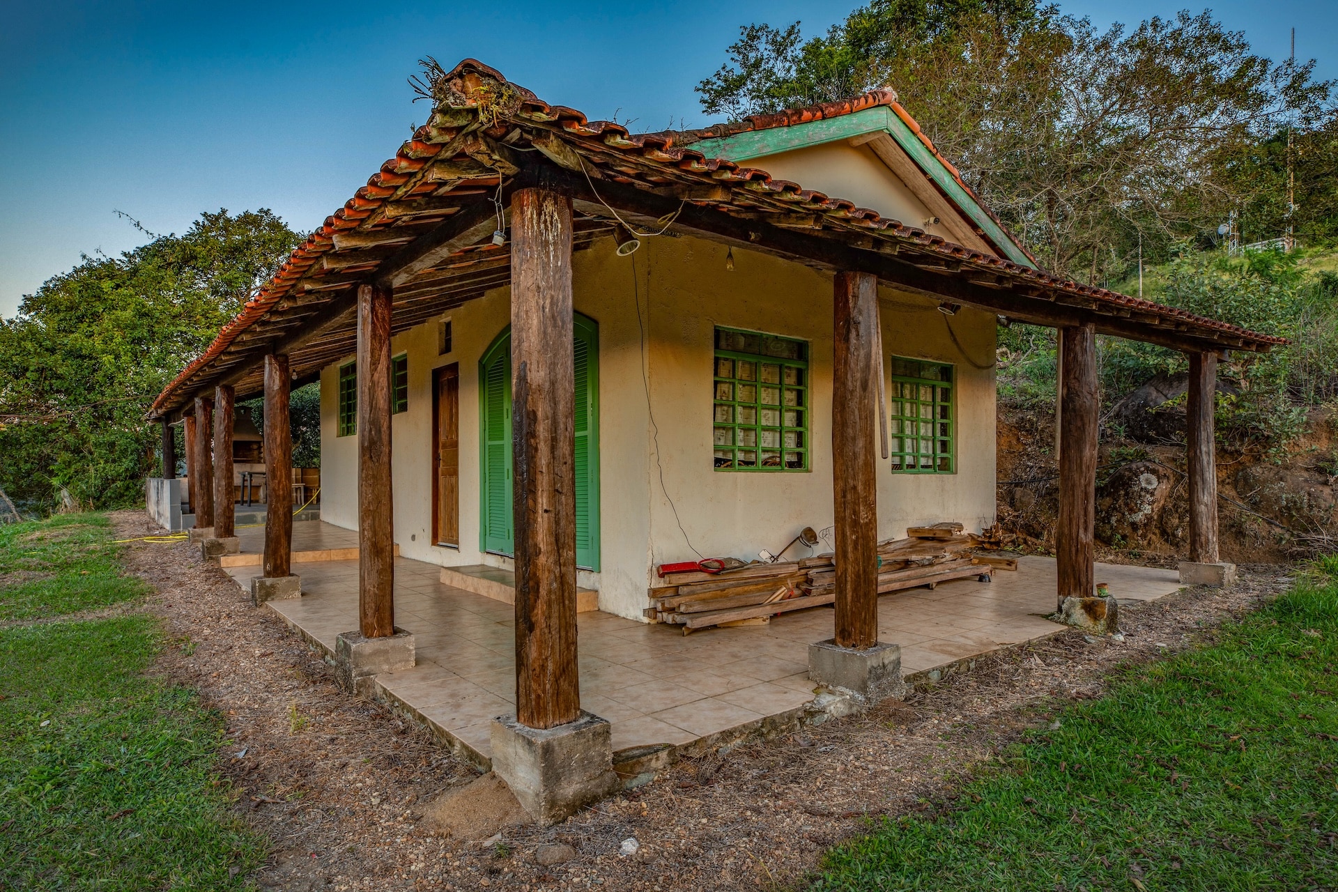 A propriedade apresenta uma estética rústica, com paredes em tom claro contrastando harmoniosamente com as esquadrias verdes e as colunas de madeira que realçam seu charme singular. Logo à frente, um mirante de madeira revela uma vista panorâmica das montanhas, enriquecida pelo pôr do sol.