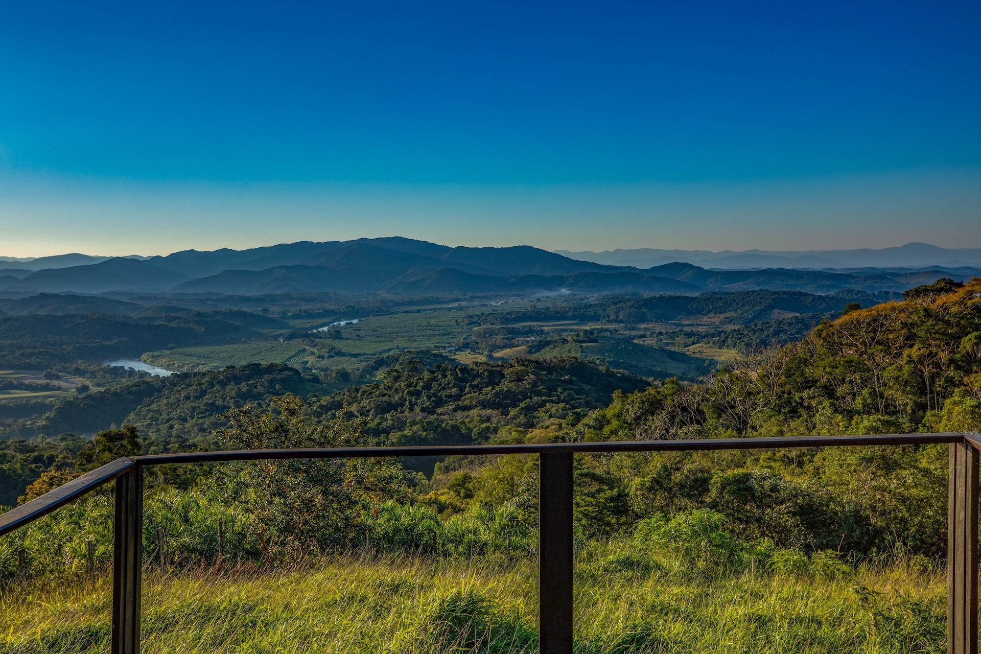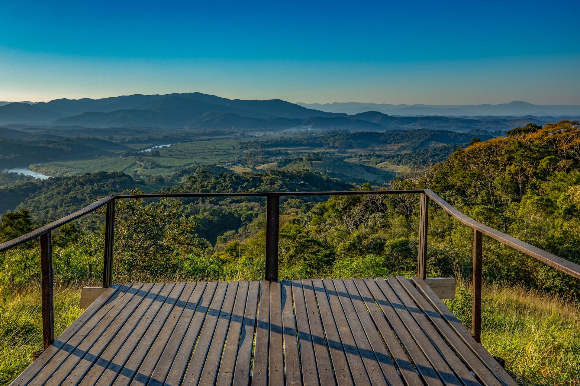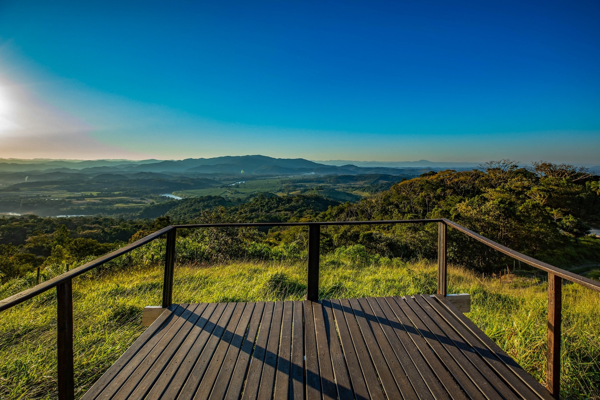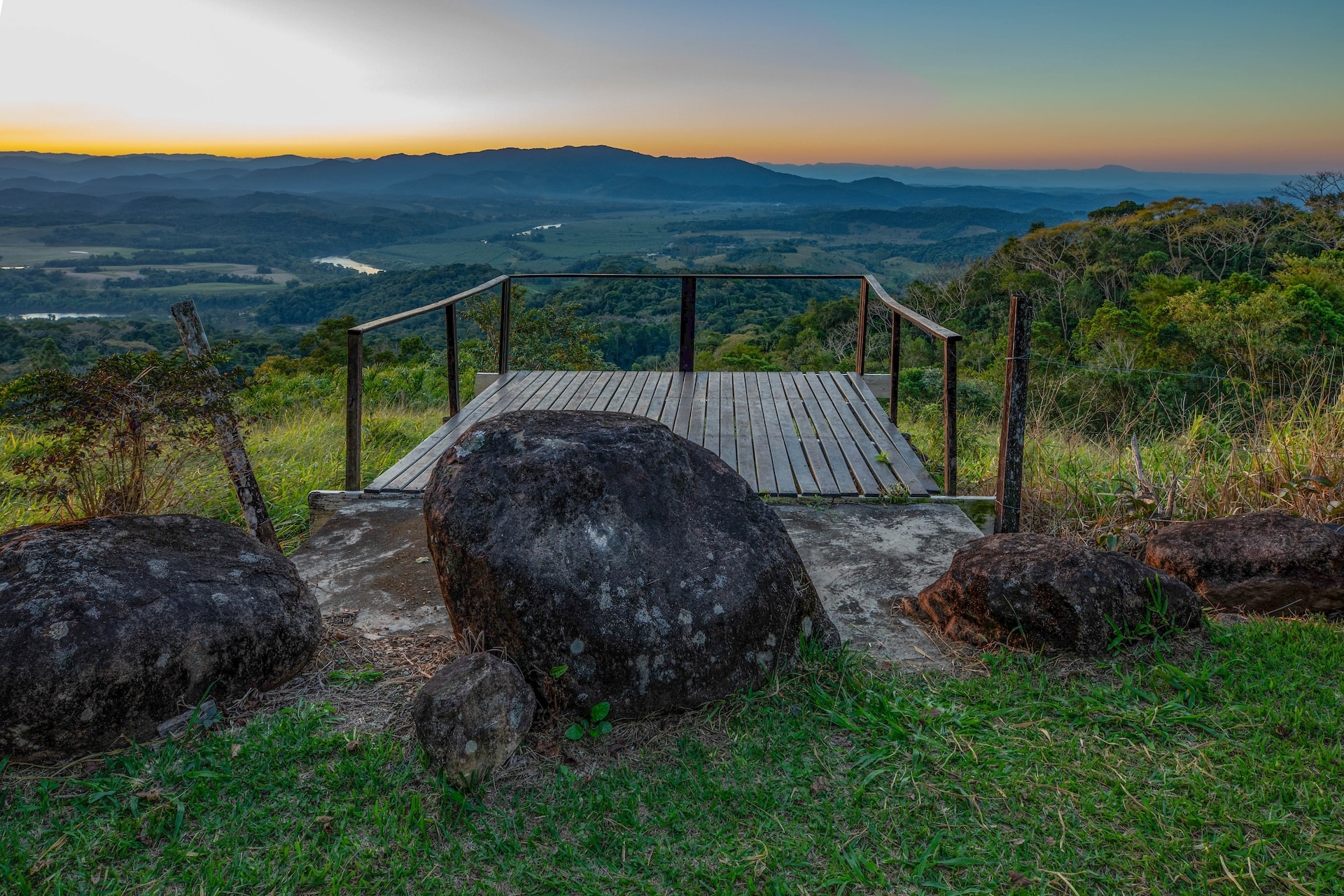 A propriedade apresenta uma estética rústica, com paredes em tom claro contrastando harmoniosamente com as esquadrias verdes e as colunas de madeira que realçam seu charme singular. Logo à frente, um mirante de madeira revela uma vista panorâmica das montanhas, enriquecida pelo pôr do sol.