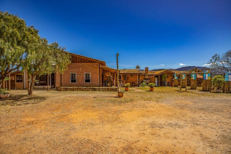 Alambique rústico, com tonéis e equipamentos utilizados na produção artesanal de cachaça.